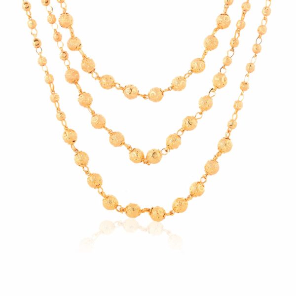 It is a three-layered necklace. The material used is alloy. The jewellery is of 18 carat.It is a designer jewellery by Bhagya collections.