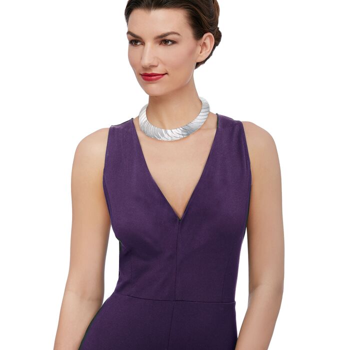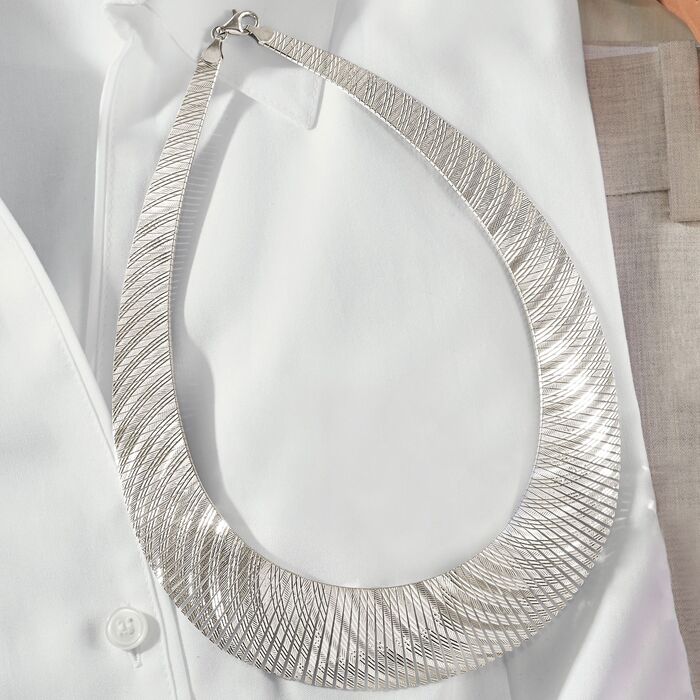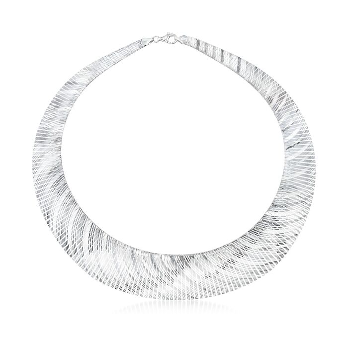 This Cleopatra necklace is far from shy! Glittering with a swirling diamond-cut pattern, it boldly graduates from 1/4″ to 1″ towards the center. Made in Italy. Lobster clasp, sterling silver necklace.